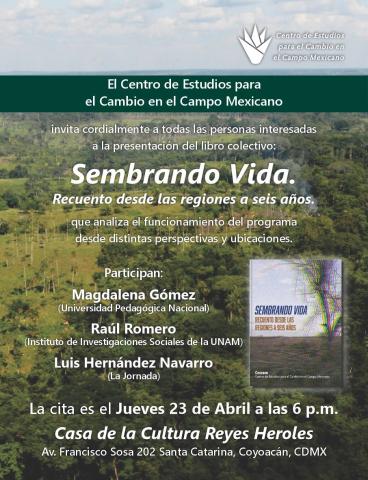 Presentación del libro colectivo: Sembrando Vida. Recuento desde las regiones a seis añosEl Centro de Estudios para el Cambio en el Campo Mexicano invita cordialmente a todas las personas interesadas a la presentación del libro colectivo: Participan: La cita es el Jueves 23 de Abril a las 6 p.m. |